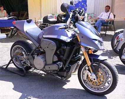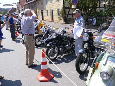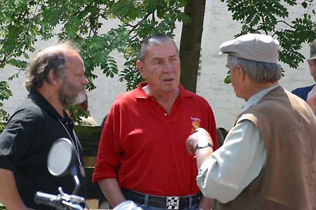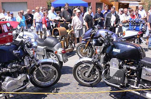 Aber längst nicht genug. Manfred Waikinat, einer der unermüdlichen Organisatoren, kam mit dem Wetterburger Reise- und Motorradjournalisten Winni Scheibe auf die Idee, eine Motorradausstellung mit dem Titel "Heiße Öfen - Gestern und Heute" auf die Räder zu stellen. Und weil Winni Scheibe zu den ausgewiesenen Münch-Kennern zählt, waren die Highlights schnell gefunden. Bernd Gehrken aus Bremen kam mit seinen beiden Münch-4 TTS und TTS-E, DBH aus Lüneburg stellte einen Münch-4 Schnittmotor zur Verfügung, Thomas Petsch aus Würzburg, Hersteller der sündhaft teuren Münch Mammut 2000 steuerte eine von nur 15 gebauten Maschinen sowie eine klassische Münch-4 TTS-E bei und Peter Kleine aus Bad Arolsen rollte mit seinem picobello restaurierten NSU Prinz TT auf das Gelände. |